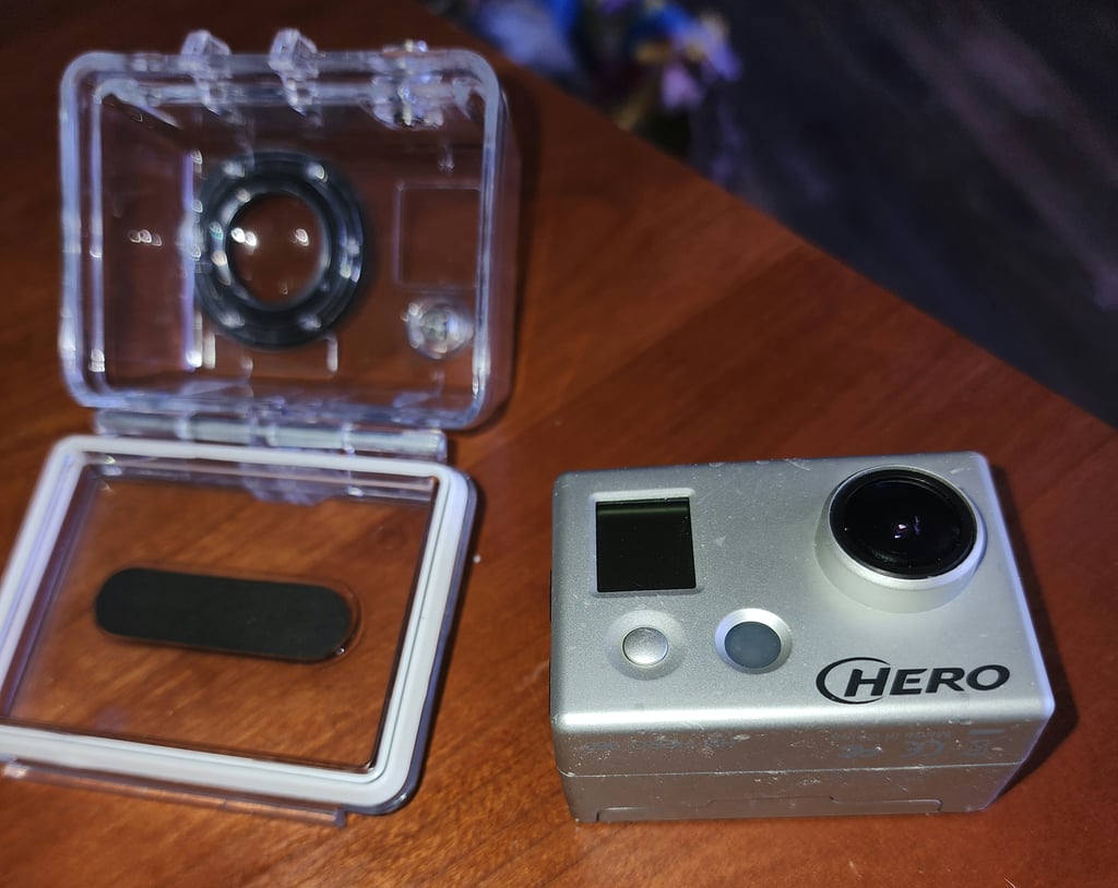 older GoPro 960 with waterproof case. Good to attach to drones. No charging cable with this camera.